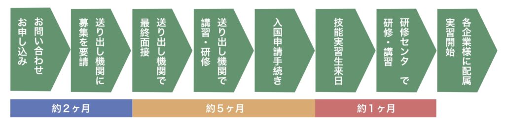 技能実習生来日送り出し機関での3ヶ月間の講習を終え、技能実習生がいよいよ来日します。当組合が実習生を空港まで出迎え、研修センターまでご案内しますので、ご安心ください。
